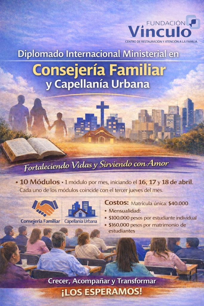 Nos complace anunciar que el Diplomado Ministerial en Consejería Familiar y Capellanía Urbana, respaldado por el Ministerio Internacional Vínculos para el Cambio y una Fundación asociada al Ministerio de Educación del Ecuador, inicia en el mes de abril, brindando un espacio de formación integral para quienes desean fortalecer sus competencias en consejería, acompañamiento pastoral y capellanía en contextos urbanos.